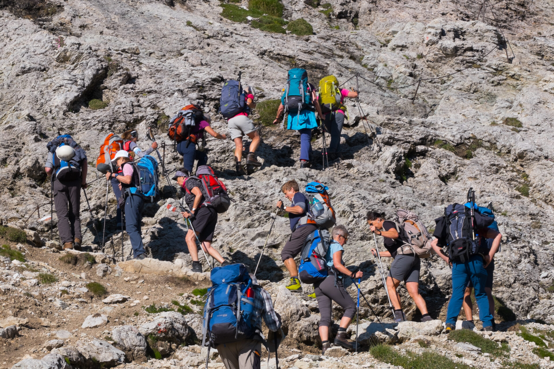 Am Sonntag früh startete die Sektionsfahrt des DAV Sulzbach-Rosenberg nach Südtirol zum Rosengarten. Dank Kaffeepause mit Apfelkuchen von Gudrun Fackler wurde die lange Busfahrt etwas angenehmer. Von Compatsch aus wanderte dann die Gruppe über die Seiser Am zur Tierser Alpl Hütte auf 2440m. Die im Jahr 2015 neu renovierte Hütte bietet neben sehr leckerem Essen, eine interessante Übernachtung an. Der nächste Tag begann mit strahlendem Sonnenschein, das war aber leider trügerisch. Am Mittag zogen Gewitterwolken auf, sodass die geplante Überschreitung mit Klettersteig am Kesselkogel entfallen musste. Stattdessen ging es über den Molignolpass und Grasleitenpass zügig zur Vajolethütte. Nachmittags entschloss sich ein Teil der 25 Teilnehmer, noch den Aufstieg zur Gartlhütte auf 2621m zu machen, um auf die Vajolettürme einen fantastischen Blick zu haben. Der Rosengarten ist Teil des Naturparks Schlern-Rosengarten und wurde 2009 zum Dolomiten UNESCO Welterbe erklärt. Das ist sehr wahrscheinlich auch ein Grund, weshalb eine Bergeinsamkeit in diesem Gebiet nicht zu erwarten ist. Am folgenden Tag, bei beständigem Wetter, teilte sich die Gruppe auf, einige wanderten über die Kölner Hütte zur Rotwandhütte des Trentiner Alpenvereins, andere nahmen den direkten Weg über den Vajolonpass (2560m ) und noch ein Teil nahm die Klettersteige über die Rotwand und den Masare-Kamm. Alle konnten unverletzt den Abschlussabend genießen, einmal mehr mit einer Einlage von Helmut Fackler als Schneitzelreiter Schönheitskönigin. Blieb nur noch der Abstieg zum Karerpass, von dort erfolgte die Heimreise. Unterwegs war das Christomannos Denkmal zu bewundern, ein großer Bronzeadler zum Andenken an den Förderer des Südtirol Tourismus.