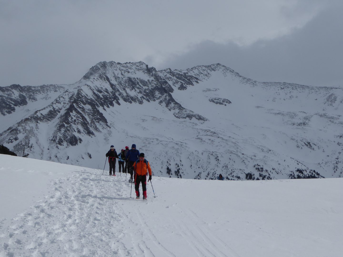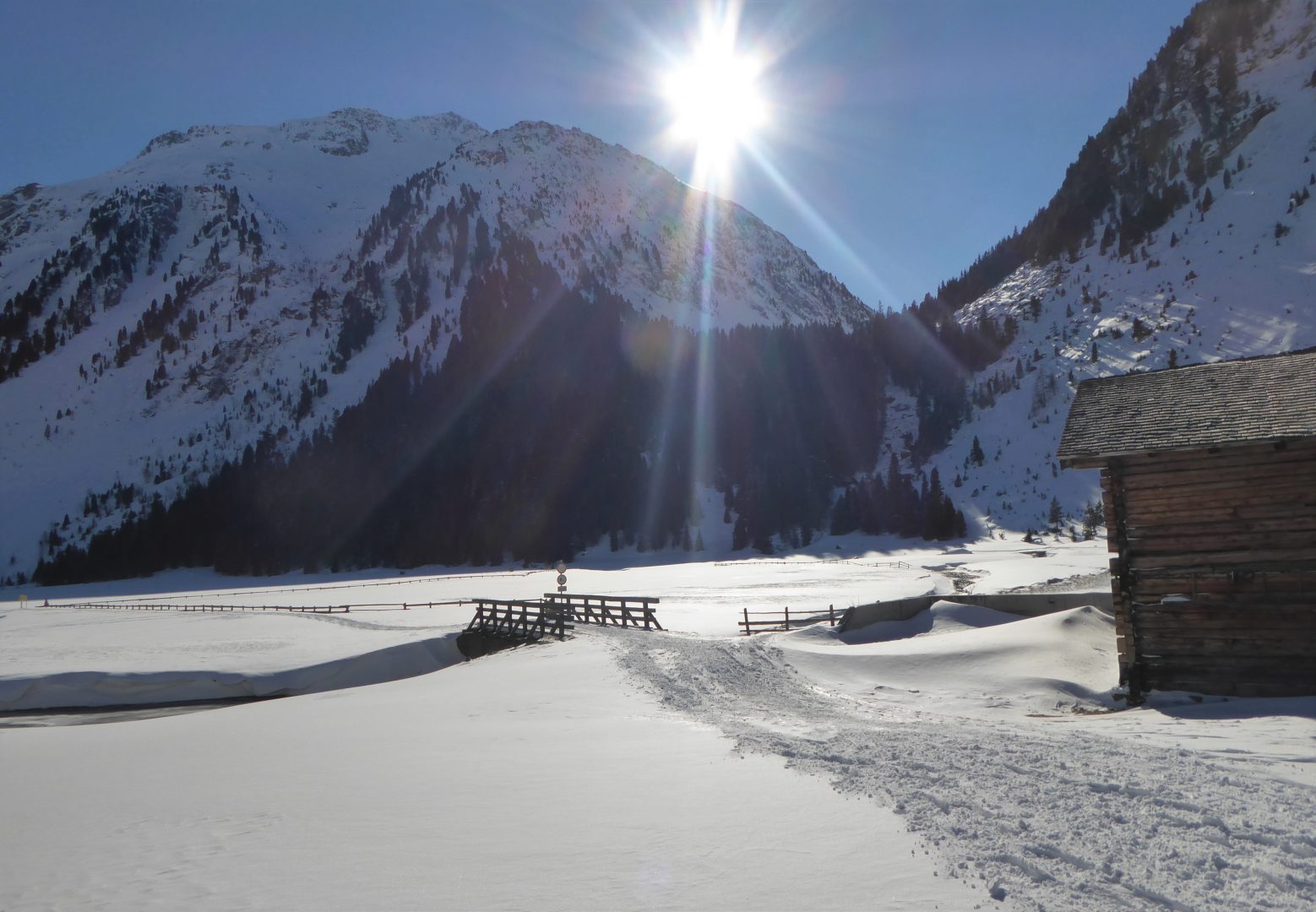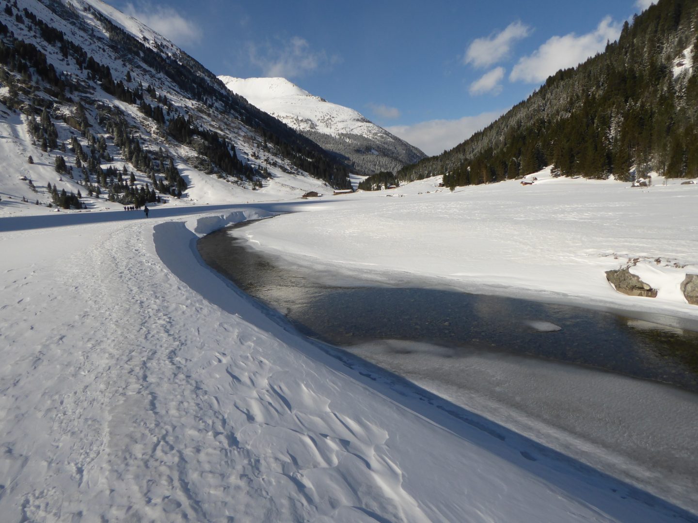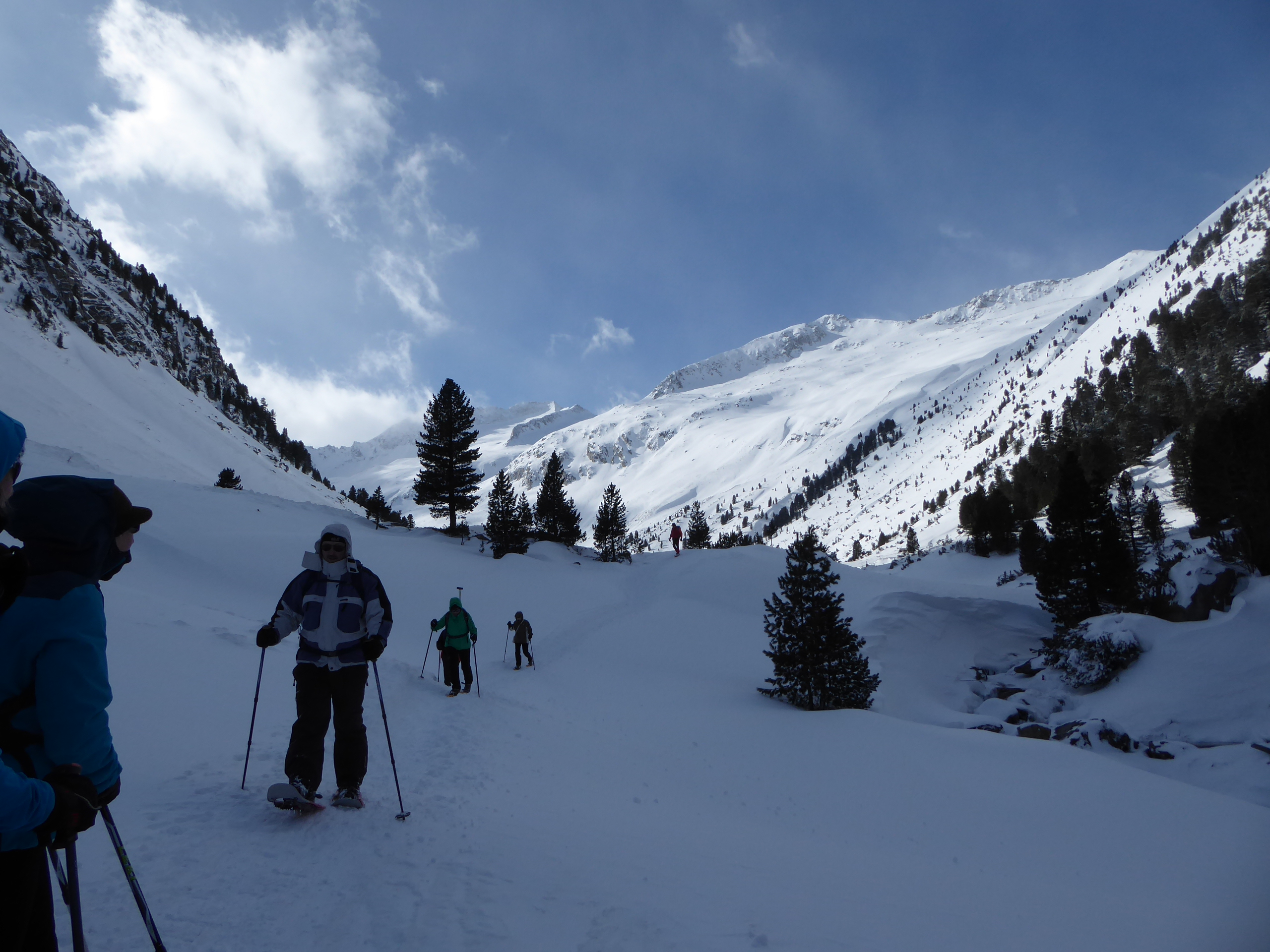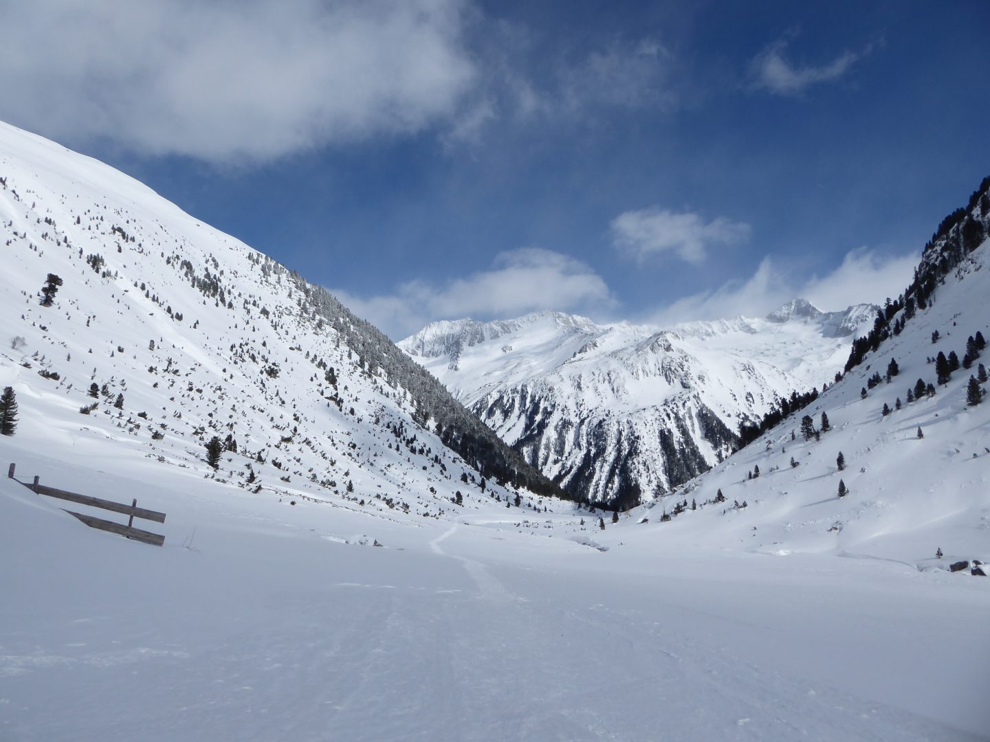 Am Samstag ging es um 9:30 gleich nach dem Tauernhaus 270 Hm im Wald steil bergauf, oberhalb der Baumgrenze führte uns der Weg in das wunderschöne Reinbachtal Richtung Richterhütte. In diesem zu tiefst verschneiten Tal hatten wir bei sonnigem, aber teilweise böigem Wind ein grandiose Aussicht auf Reichenspitz und Richterspitze.